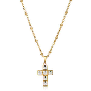 Collana girocollo in acciaio 316L e finitura pvd oro 14K con pendente a forma di croce e cristalli.