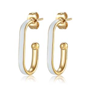 Orecchini rettangolo aperti in acciaio 316L, finitura pvd oro 14K e smalto bianco.