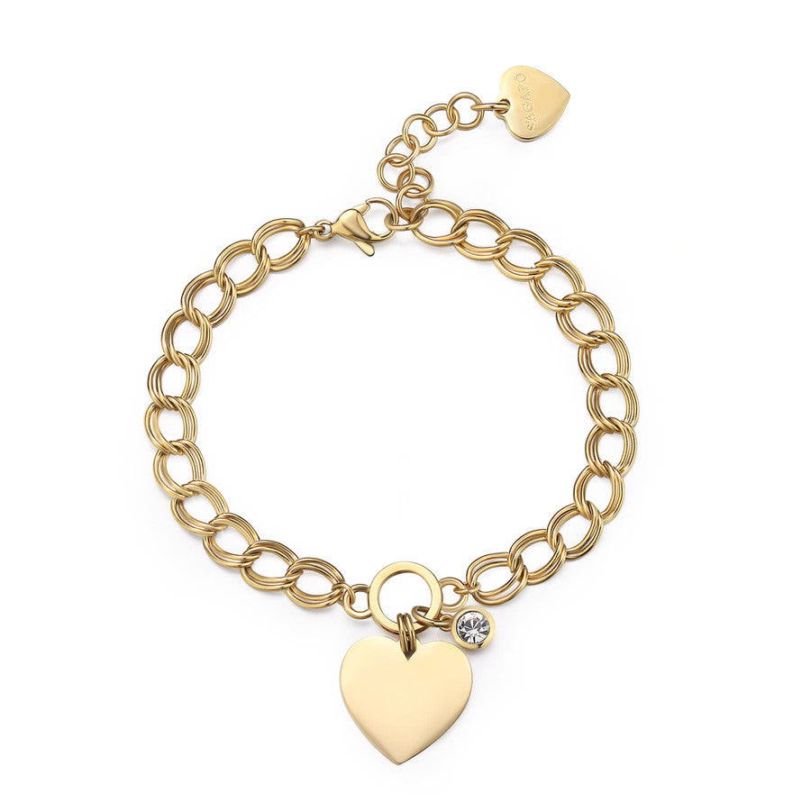 Bracciale in acciaio 316L e finitura pvd oro 14K con catena groumette doppia, pendente a forma di cuore e cristallo.