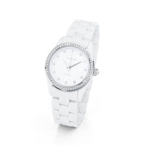 Orologio solo tempo in acciaio 304 con quadrante copper bianco e cristalli, con cinturino in policarbonato bianco.