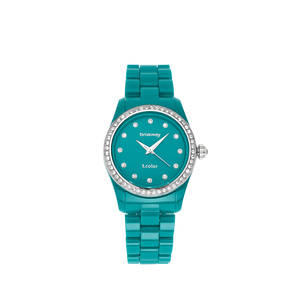 Orologio solo tempo in acciaio 304 con quadrante copper turchese e cristalli, con cinturino in policarbonato turchese.