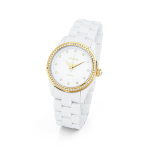 Orologio solo tempo in acciaio 304 con quadrante copper bianco e cristalli, finitura pvd oro 14K con cinturino in policarbonato bianco.