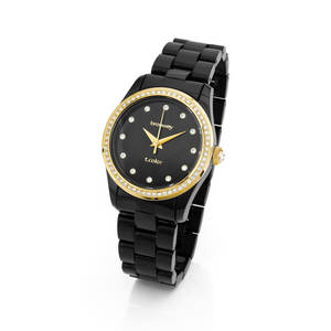 Orologio solo tempo in acciaio 304 con quadrante copper nero e cristalli, finitura pvd oro 14K con cinturino in policarbonato nero.